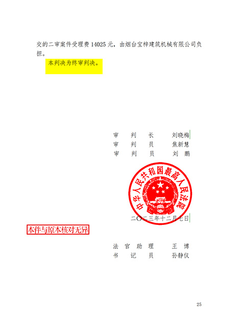 山東金道成機械有限公司于2021年11月26日立案起訴煙臺寶梓建筑機械有限公司侵犯“鍋爐爐膛檢修升降平臺”的專利權(quán)一案,經(jīng)過一審、二審法院2年零11天的審查,于2023年12月07日,中華人民共和國最高人民法院做出(2022)最高法知民終1774號的終審判決: